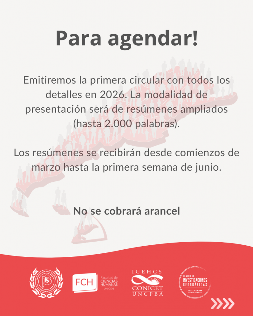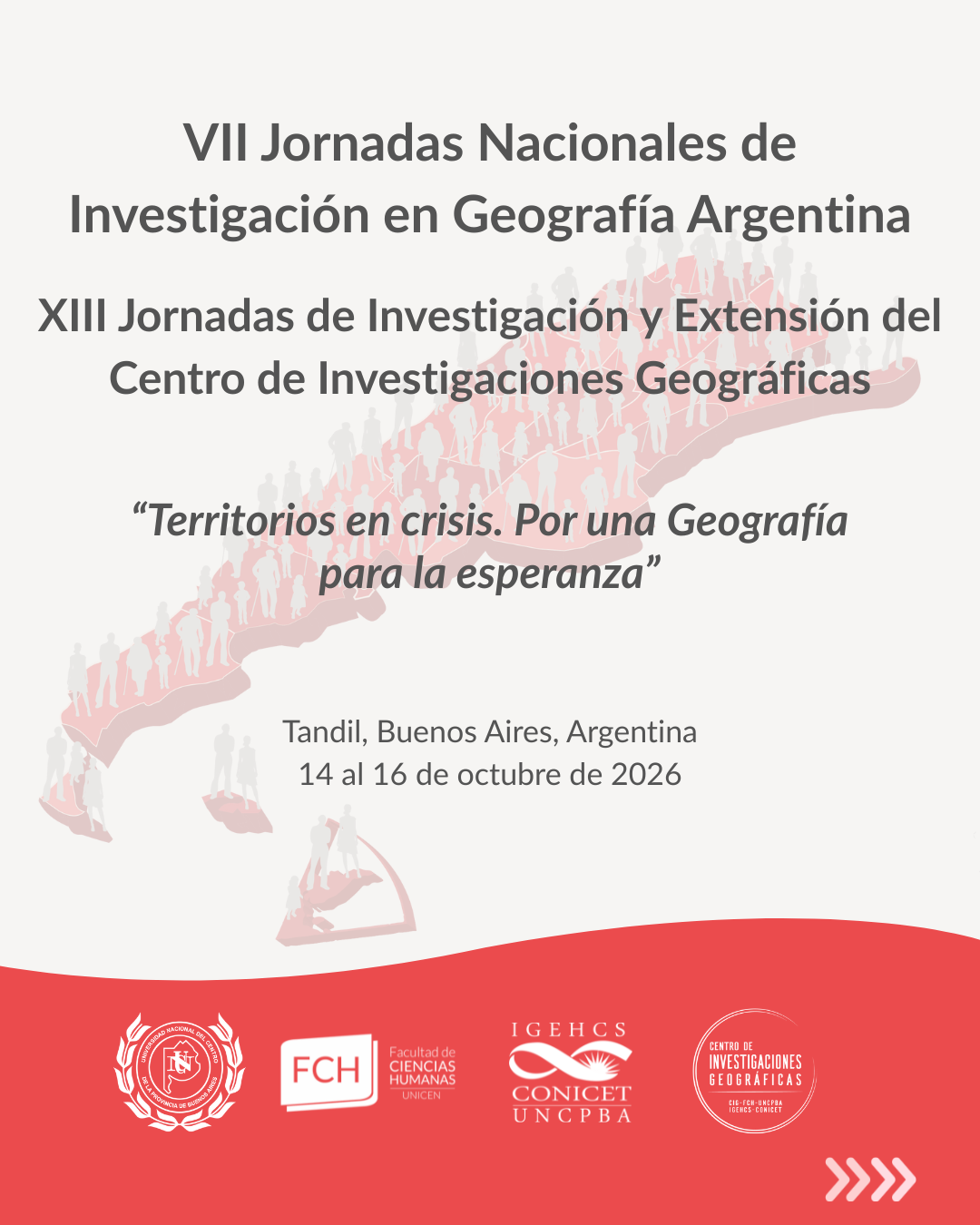 Bajo el lema “Territorios en crisis. Por una Geografía para la esperanza” los días 14, 15 y 16 de octubre del 2026 se realizarán las VII Jornadas Nacionales de Investigación en Geografía Argentina y las XIII Jornadas de Investigación y Extensión del Centro de Investigaciones Geográficas.